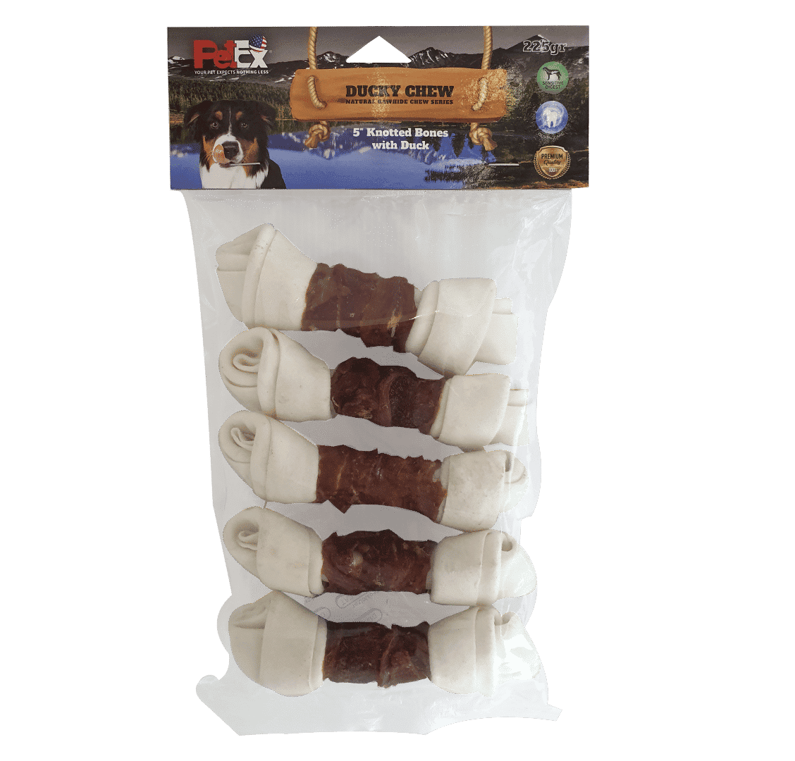 אריזה של 5 עצמות לעיסה עם בשר ברווז מובחר , מצוין לניקוי השיניים , חלבון אלטרנטיבי לכלבים עם אלרגיות